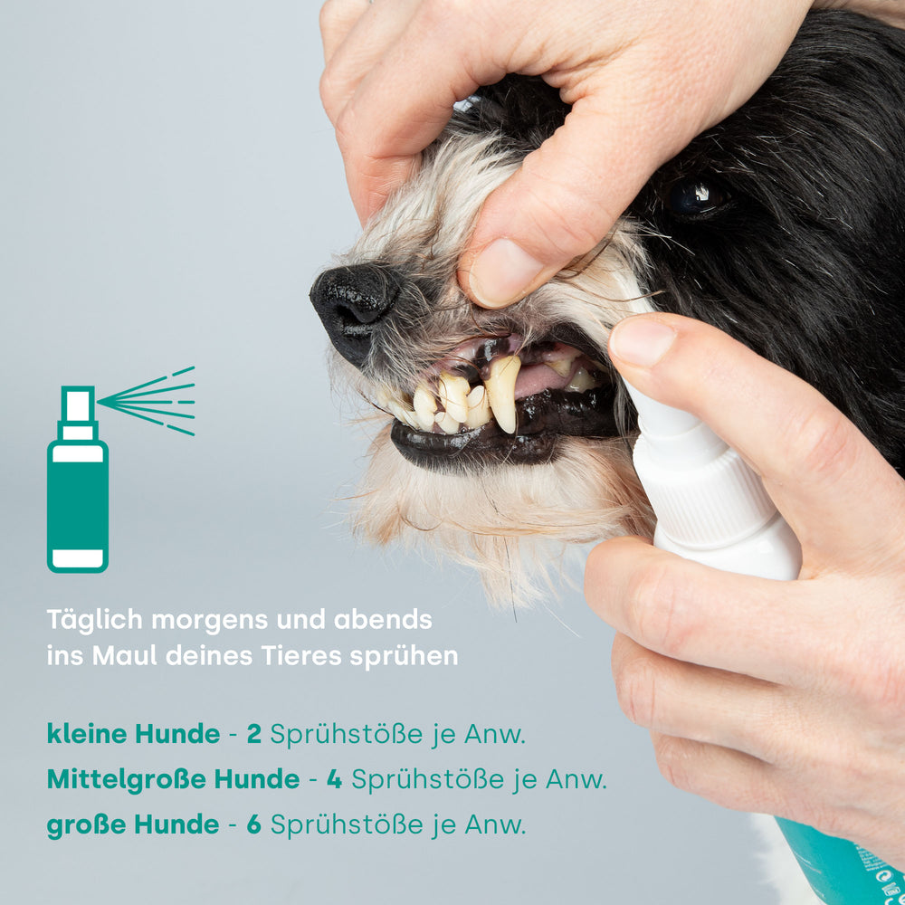 - Täglich morgens und abends ins Maul Deines Tieres sprühen