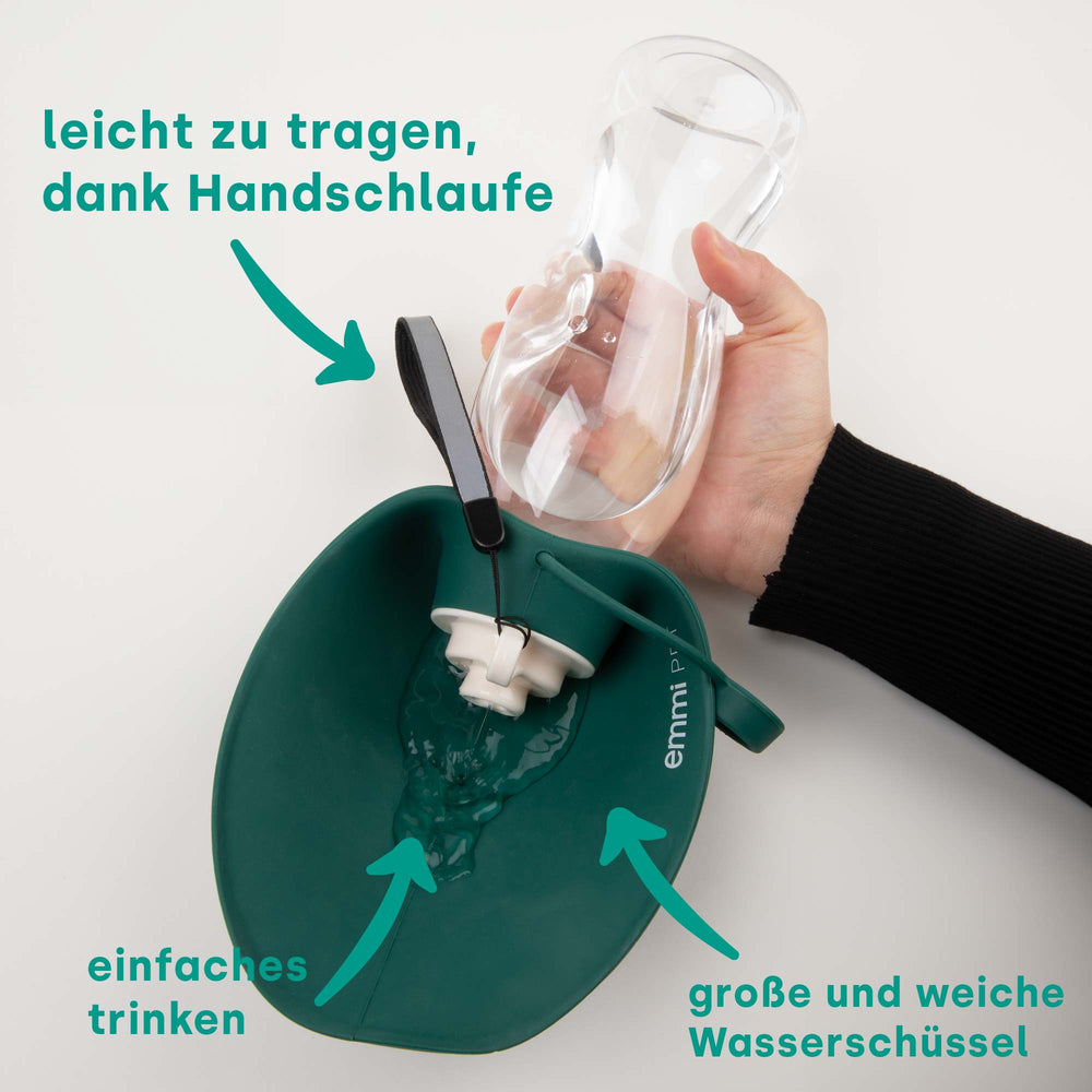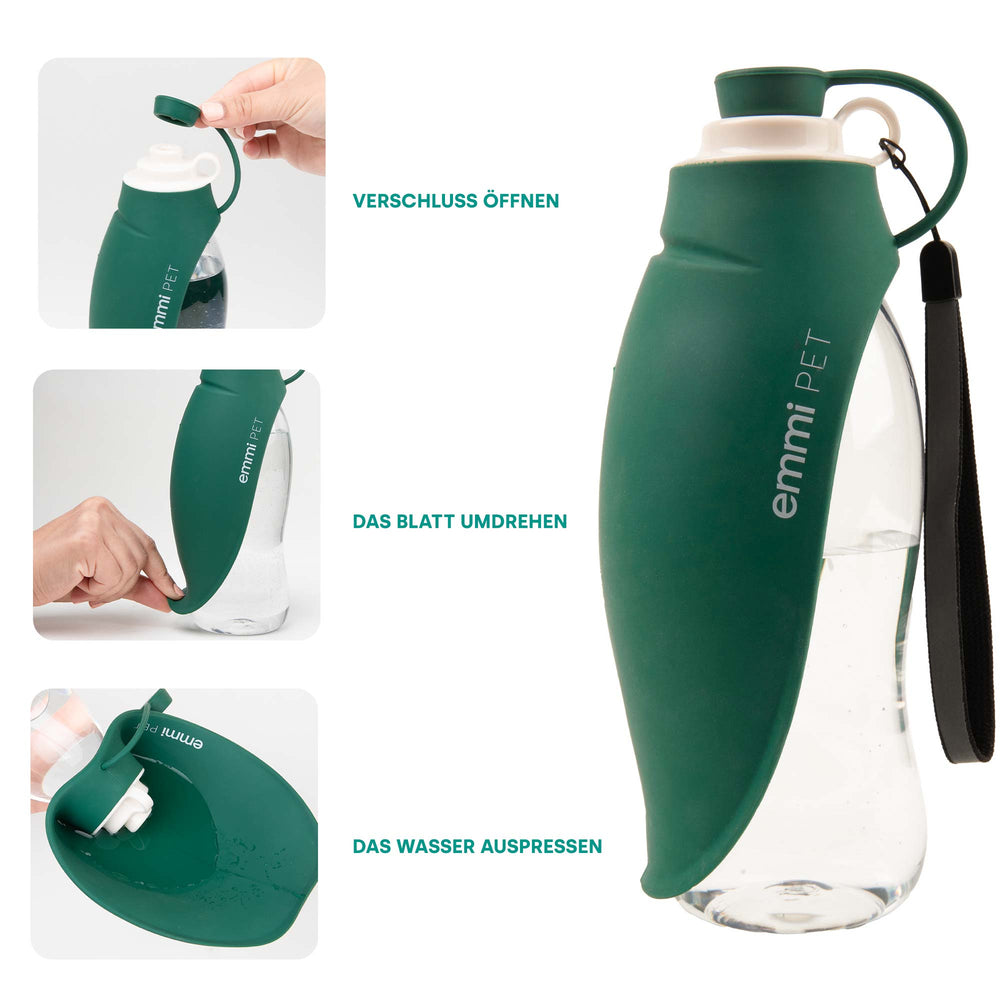 Bei Anstrengung oder Hitze brauchen Hunde besonders viel Wasser. Auf Reisen oder beim Spaziergang ist es manchmal nicht leicht, den Vierbeiner mit frischem Wasser zu versorgen. Unterwegs ist es dann nicht verwunderlich, wenn das Tier Durst bekommt und aus Pfützen oder Tümpeln trinkt. Doch das Wasser kann Krankheitskeime enthalten und zu Verdauungsproblemen führen. Deshalb ist die emmi-pet Hunde Trinkflasche die ideale Lösung für unterwegs. Mit der Reisetrinkflasche hast du immer reichlich Wasser parat.