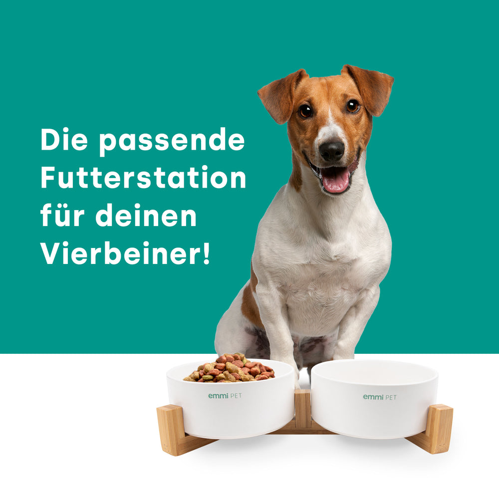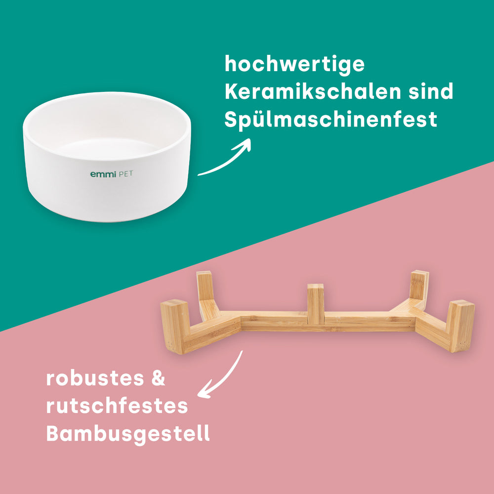 Der emmi-pet Wasser- und Futternapf in einem besteht aus hochwertigem Keramik und bietet eine praktische sowie platzsparende Lösung für die Fütterung deines Hundes. Um den täglichen Gebrauch standzuhalten ist er sehr robust und gewährleistet eine lange Lebensdauer. Die angenehme Schwere der zwei Näpfe sowie das dazu passende Holzgestell bieten Stabilität und sichern den Genuss der täglichen Futterration. Die glatte Oberfläche der Hundenäpfe machen eine tägliche Pflege und Hygiene einfach. Sie können mit der Hand gespült oder in der Spülmaschine gereinigt werden. Dank der rutschfesten Basis stehen die Keramiknäpfe stabil auf dem Boden und verhindern ein Umstoßen. Das minimiert Verschüttungen und gewährleistet eine saubere Umgebung. Das Holzgestell ist mit einem Lack überzogen, um vor Wasser zu schützen. Die Futterbar für kleine und große Hunde ist dank der modernen Optik ein Blickfang für jeden Tierbesitzer.