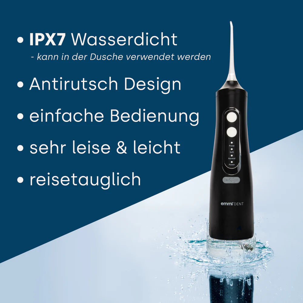 Die Munddusche von emmi-dent befreit Zahnzwischenräume von Essensresten und Plaque effektiv. Der schonende und dennoch starke Wasserstrahl sorgt für eine bestmögliche Mundspülung.