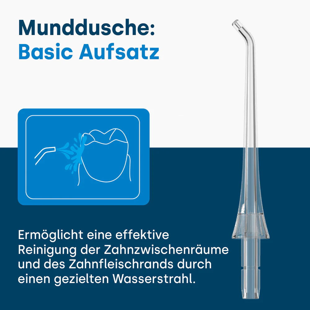 Wir haben für jeden Anwendungsfall die perfekte Aufsatzdüse! Mit den vier mitgelieferten Düsenaufsätzen haben Sie für jede Reinigung die passende Düse zur Hand. Ob Zahnspangen, Brücken oder Implantate, die Munddusche eignet sich hervorragend zur Entfernung von Ablagerungen in Zahnzwischenräumen oder sonst schwer zugänglichen Stellen..
