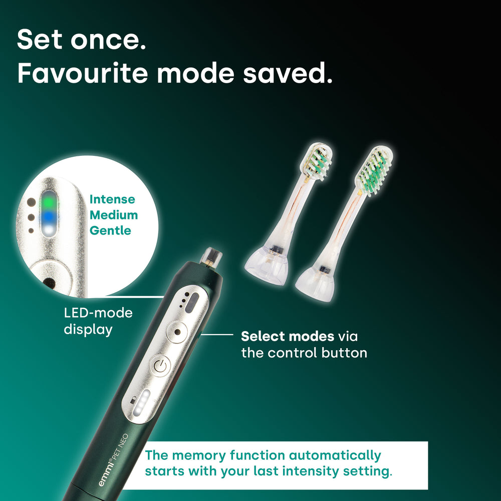 The emmi-pet attachment brushes are the core of the system and have been precisely matched to the performance of the emmi-pet NEO ultrasonic toothbrush. Whether in gentle mode for sensitive areas or intensive mode for stubborn plaque: the patented ultrasonic technology reaches even deep gum areas that are difficult to access with conventional bristles.
