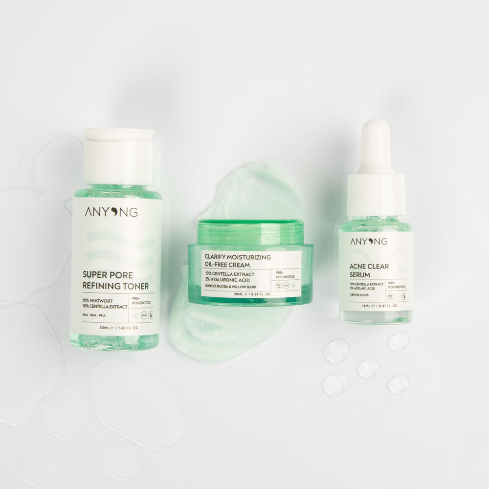 The ideal kit for impure skin. The Pore Refining Toner removes excess oils and thus provides an ideal foreplay. The highlight for clear skin is the Acne Clear Serum, which contains cantella extract and azelaic acid. It reacts specifically to your skin problems and regenerates your skin. The oil-free and clarifying moisturizer is the cosy finishing touch.