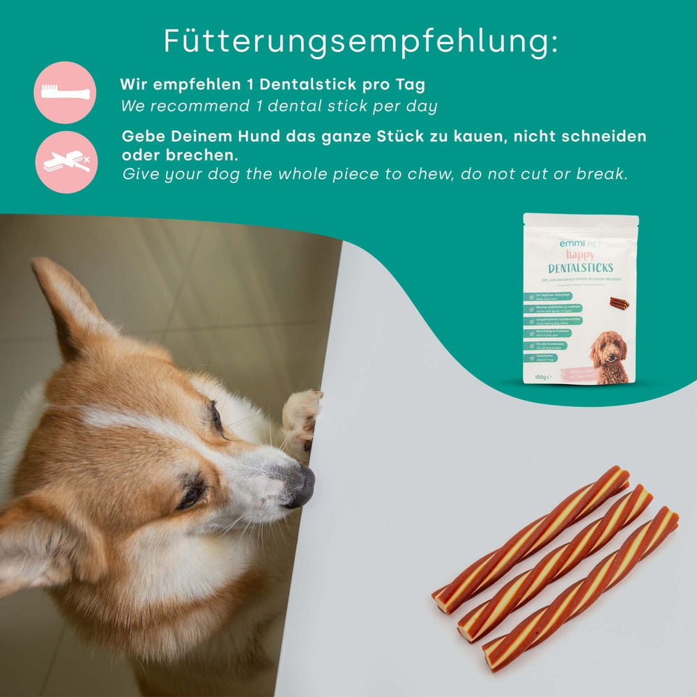 The emmi-pet Teeth Polisher Dental Sticks contribute to your dog's oral health by effectively tackling plaque and tartar, caring for the gums and reducing the formation of new deposits. Our dental sticks for dogs are a natural addition to the toothbrush and perfect for daily use.