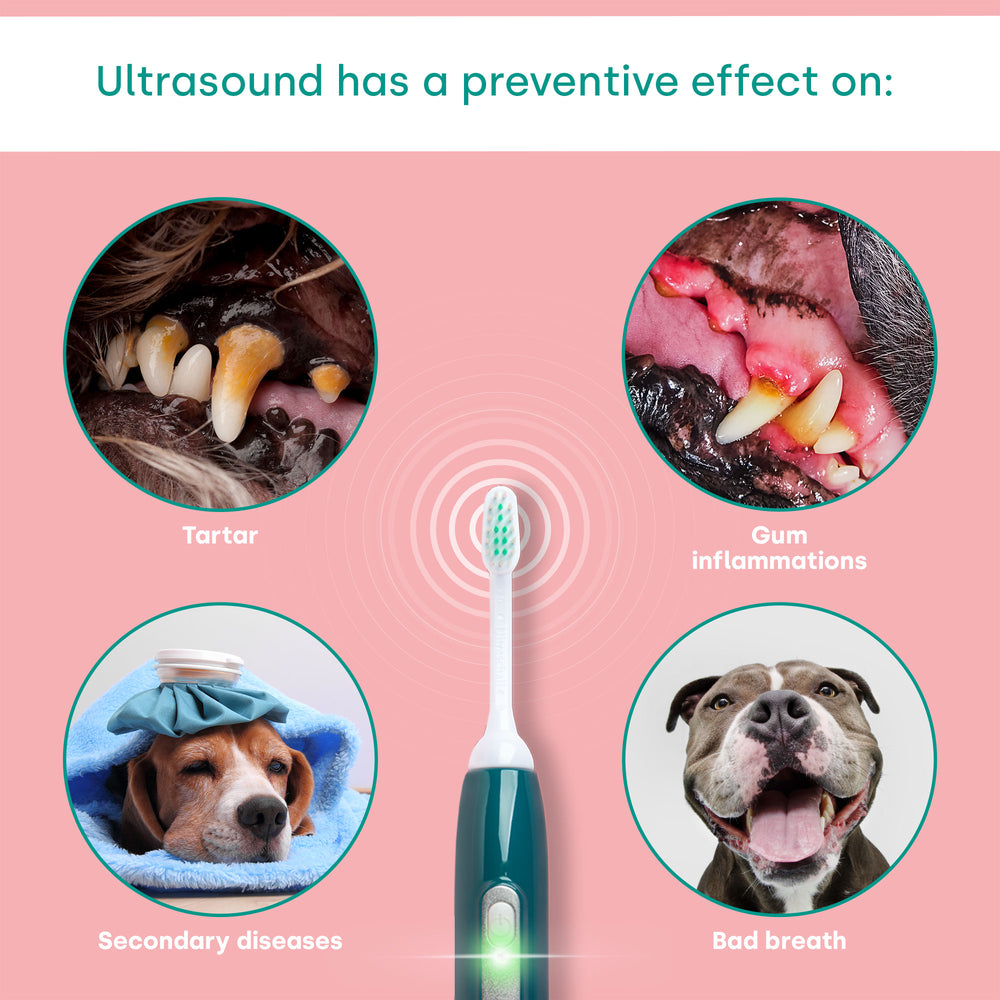Unlike traditional brushes that rely on mechanical cleaning, it uses the gentle power of ultrasound to remove or reduce plaque and bacteria. This innovative method is not only more effective in preventing tartar and gum disease, but is also gentler on your dog's gums and teeth. This makes it an ideal choice for dogs of all sizes and ages, including sensitive or elderly animals where gentle care is especially important.