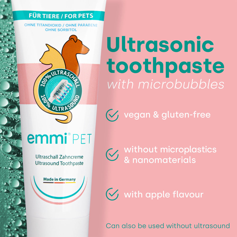 Ideal clip-on brushes for both small dogs and large dogs. Specifically designed to cater to every size and breed optimally. The emmi-pet PRO basic set contains two specially developed clip-on brushes (1x large, 1x small), suitable for both small and large dogs. With the emmi-pet ultrasound toothpaste, which is free from titanium dioxide and parabens, dental care becomes even safer and gentler.