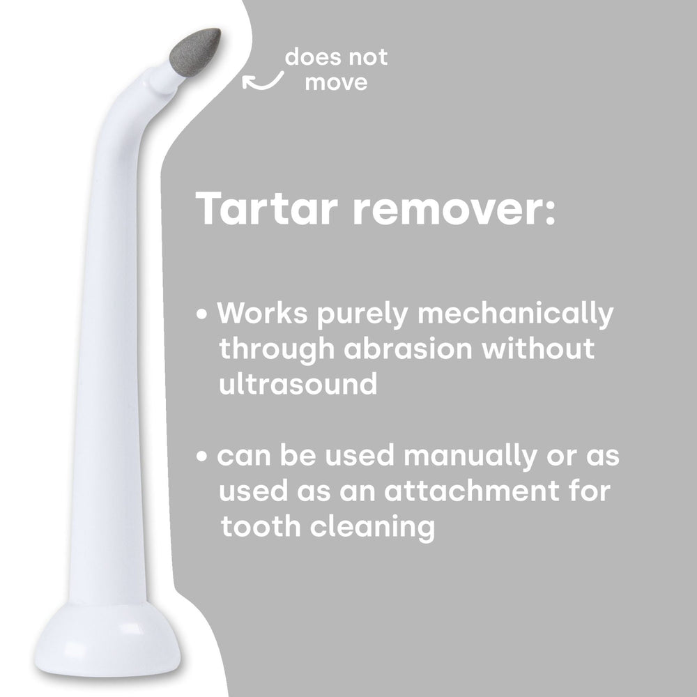 The emmi tartar remover can be used manually or as an attachment for cleaning teeth. It works purely mechanically through abrasion without ultrasound.
