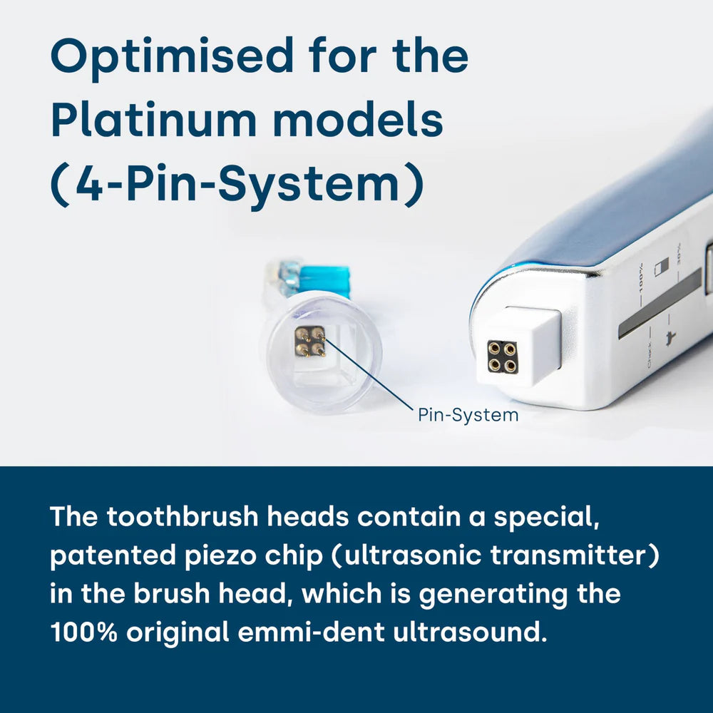 The ultrasonic brush head of the emmi-dent Ultrasonic toothbrushes contain a special, patented piezo chip (ultrasonic generator) in the brush head to generate the 100% original emmi-dent Ultrasound. In the sockets of the emmi-dent Platinum Ultrasonic brush heads have 4 contact pins for connection to the emmi-dent Platinum handpiece integrated. This innovation prevents jamming when plugging in and the ultrasonic brush head can be easily plugged in and removed. In addition, thanks to the optimized ultrasonic timing, these are up to 4 times more effective than the brush heads of the emmi-dent Metallic.