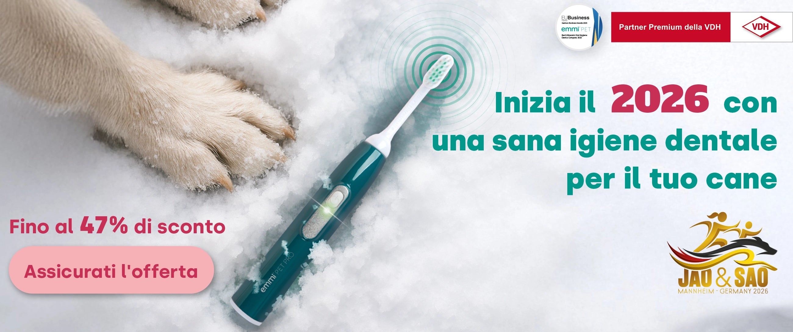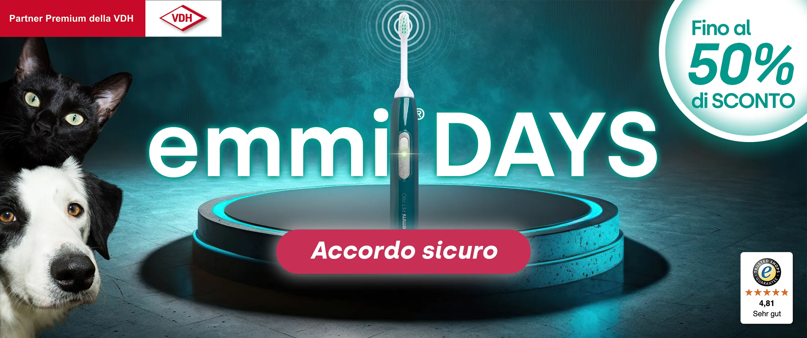 Una flora orale sana può addirittura prolungare la vita del vostro amico a quattro zampe. Con la giusta routine di igiene dentale e lo spazzolino ultrasonico per animali emmi-pet, puoi prevenire efficacemente tartaro, scolorimento dei denti e infiammazioni gengivali.