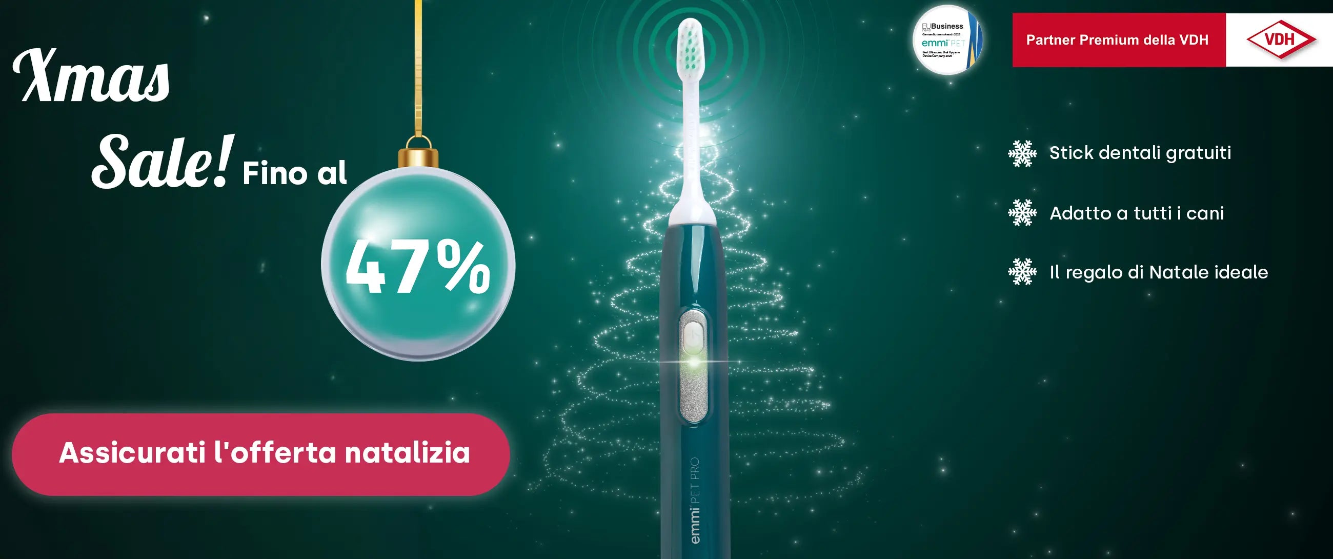 Una flora orale sana può addirittura prolungare la vita del vostro amico a quattro zampe. Con la giusta routine di igiene dentale e lo spazzolino ultrasonico per animali emmi-pet, puoi prevenire efficacemente tartaro, scolorimento dei denti e infiammazioni gengivali.