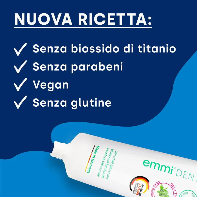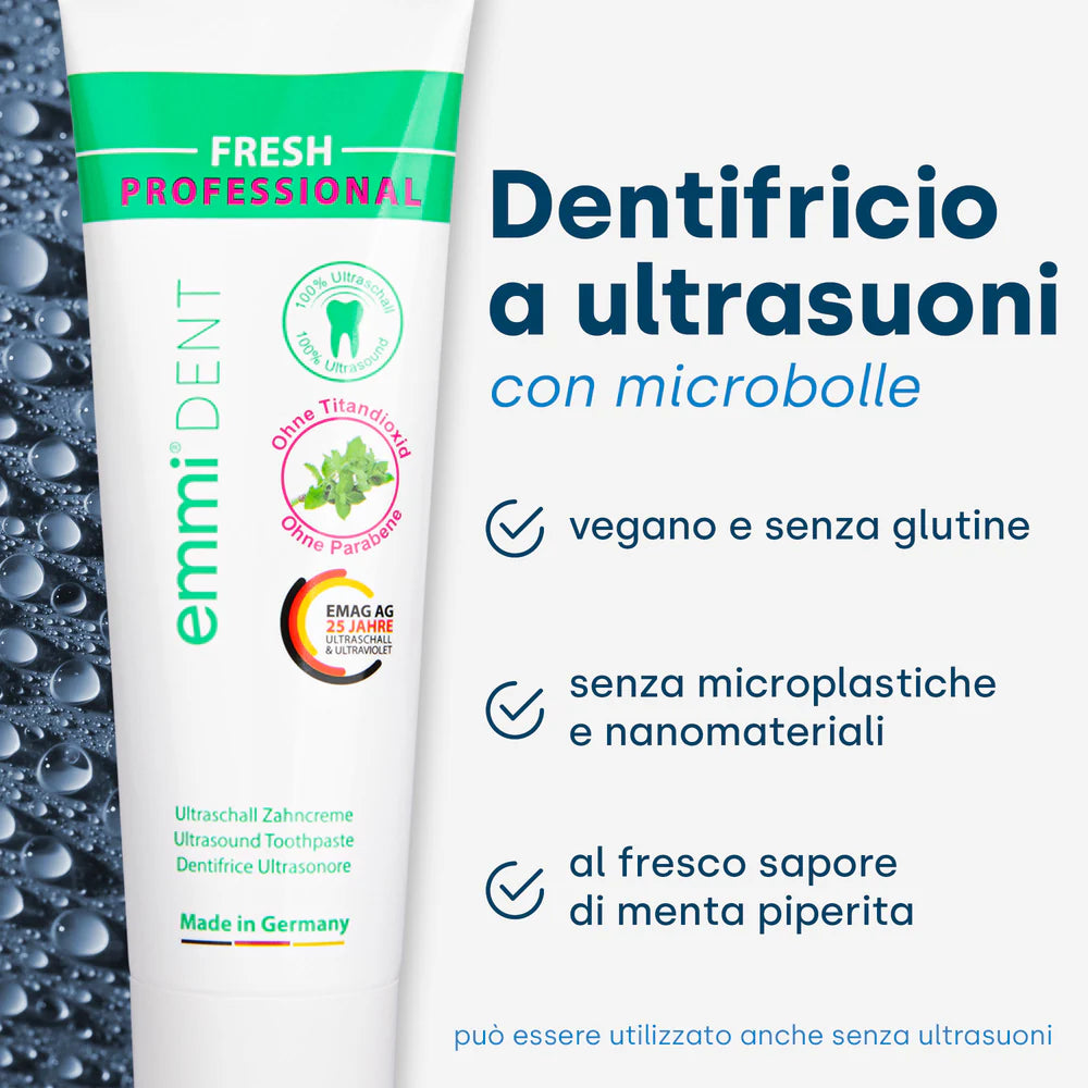 Il dentifricio emmi-dent Fresh è ideale per i denti sensibili. Pulisce delicatamente, rinforza le gengive e combatte placca e tartaro. Grazie agli ingredienti naturali, garantisce un alito fresco e una sensazione di pulito grazie alla rivoluzionaria tecnologia a ultrasuoni.