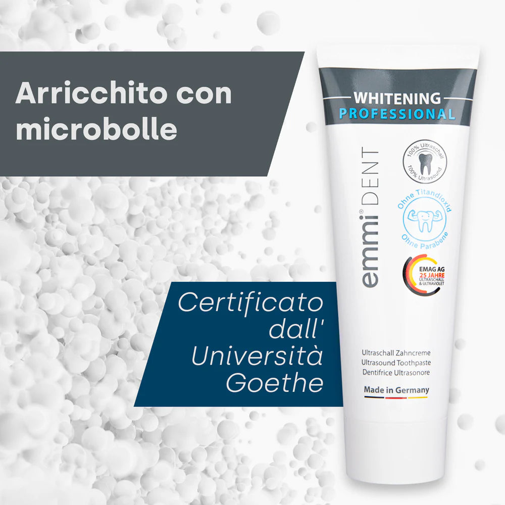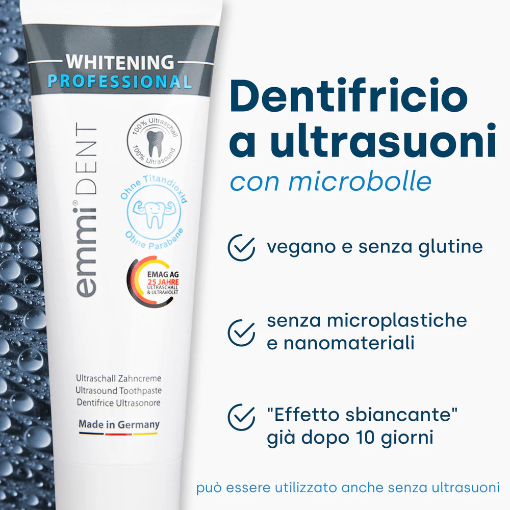 IL emmi-dent Il dentifricio sbiancante a ultrasuoni ti aiuta a ottenere un sorriso bianco smagliante senza i problemi dei metodi convenzionali. Grazie all'avanzata tecnologia ultrasonica abbinata allo spazzolino a ultrasuoni, rimuove delicatamente le macchie ostinate e fa brillare i denti. Attirerai con ansia gli sguardi di ammirazione quando sfoggerai il tuo sorriso radioso. Può essere utilizzato anche con lo spazzolino a ultrasuoni.