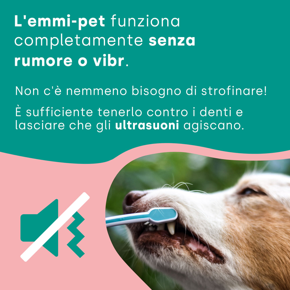 L'esclusiva tecnologia a ultrasuoni dell'emmi-pet 2.0, con fino a 96 milioni di vibrazioni ultrasoniche al minuto, offre un vantaggio significativo rispetto ai metodi di pulizia dei denti convenzionali. Questa innovazione tecnologica consente di ridurre delicatamente la placca e prevenire la formazione del tartaro, proteggendo al contempo le gengive e le zone sensibili della bocca del cane. Le onde ultrasoniche a questa frequenza non sono udibili dal cane, il che rende l'emmi-pet 2.0 particolarmente adatto agli animali.