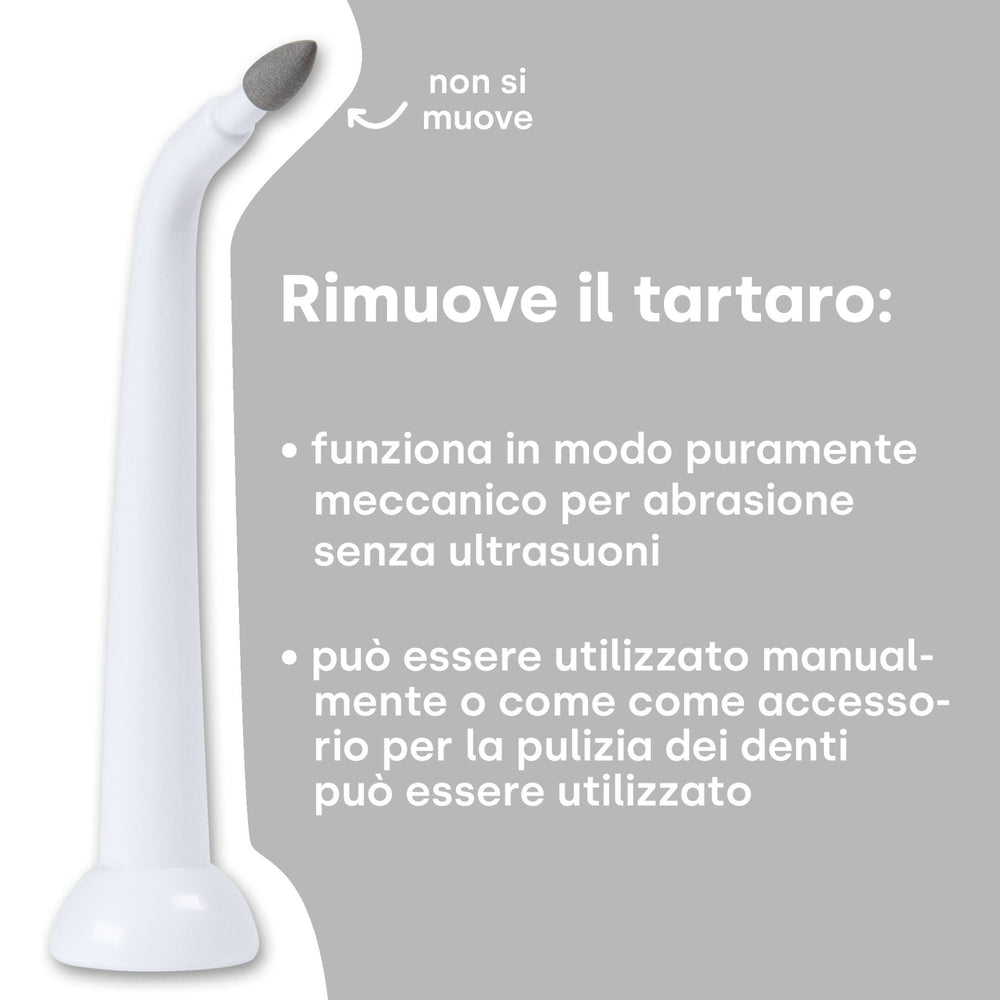 IL emmi rimozione tartaro può essere utilizzato manualmente o come accessorio per la pulizia dei denti. Agisce in modo puramente meccanico tramite abrasione, senza ultrasuoni.