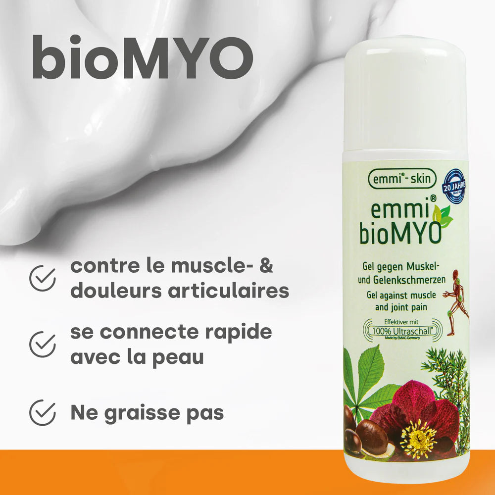 emmi-skin bioMYO est un gel contre les douleurs musculaires et articulaires, il agit comme une thermothérapie pour les douleurs articulaires et musculaires. De plus, notre crèmes optimisées par ultrasons et le mousse thermique de notre société a été testé dermatologiquement et a reçu la note très bien !