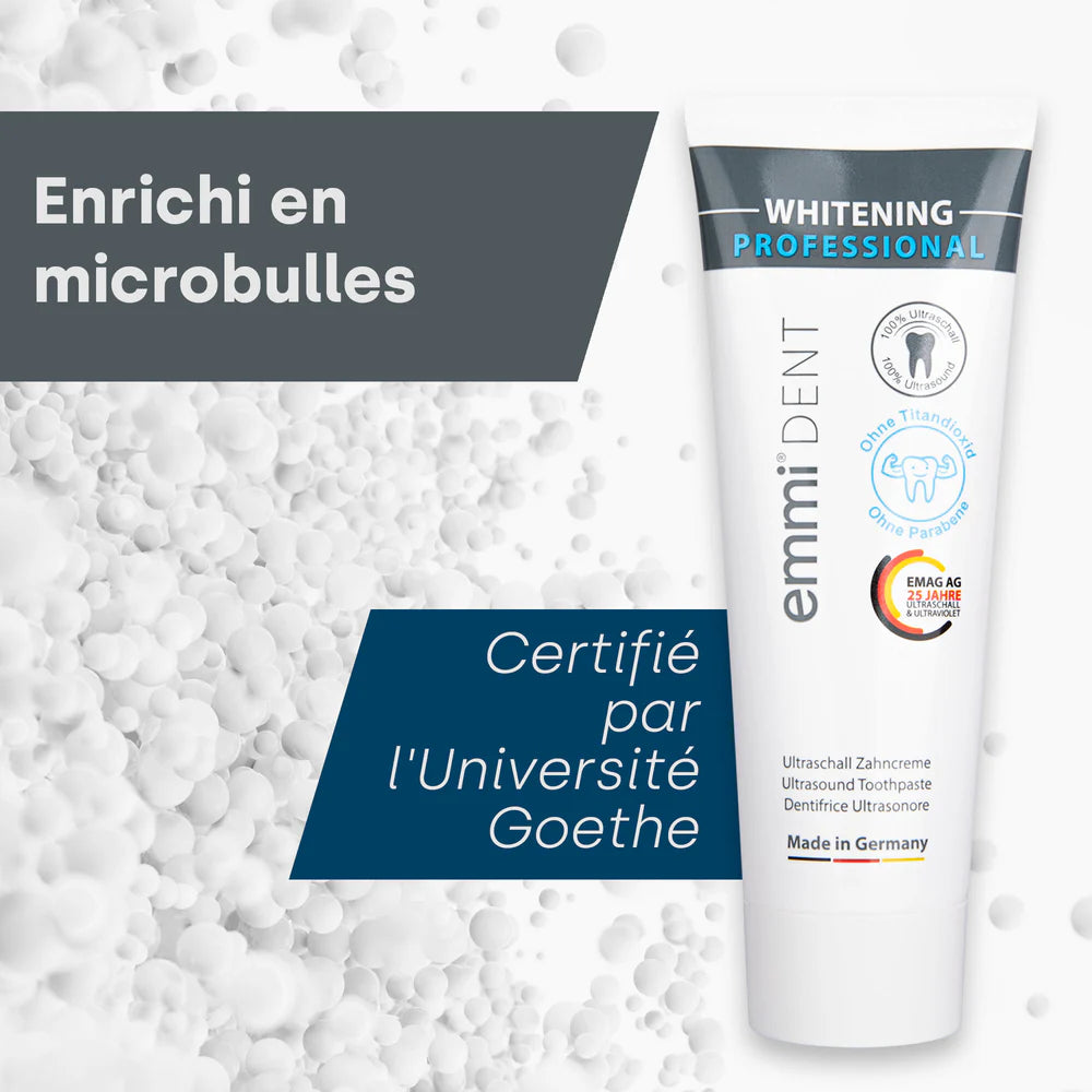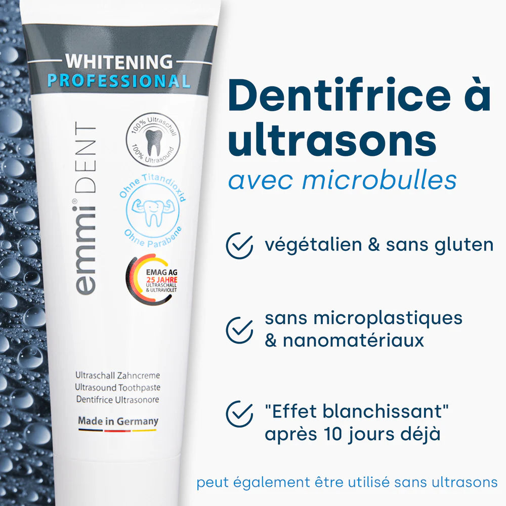 Donnez à vos dents la sensation d'un blanc éclatant avec le révolutionnaire emmi-dent Dentifrice blanchissant à ultrasons. Plongez dans le monde des fonctionnalités et des avantages uniques de emmi-dent Dentifrice blanchissant à ultrasons :