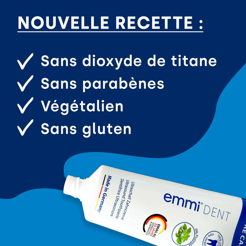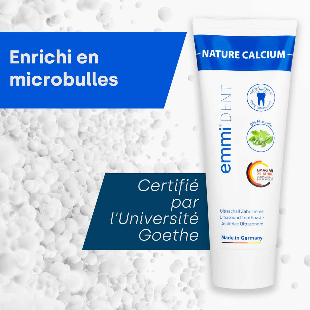 Ne manquez pas l'opportunité emmi-dent Essayez le dentifrice ultrasonique Nature Calcium et renforcez vos dents naturellement. Commandez dès aujourd'hui et profitez des bienfaits de soins dentaires de haute qualité sans fluor, mais avec la puissance du calcium.