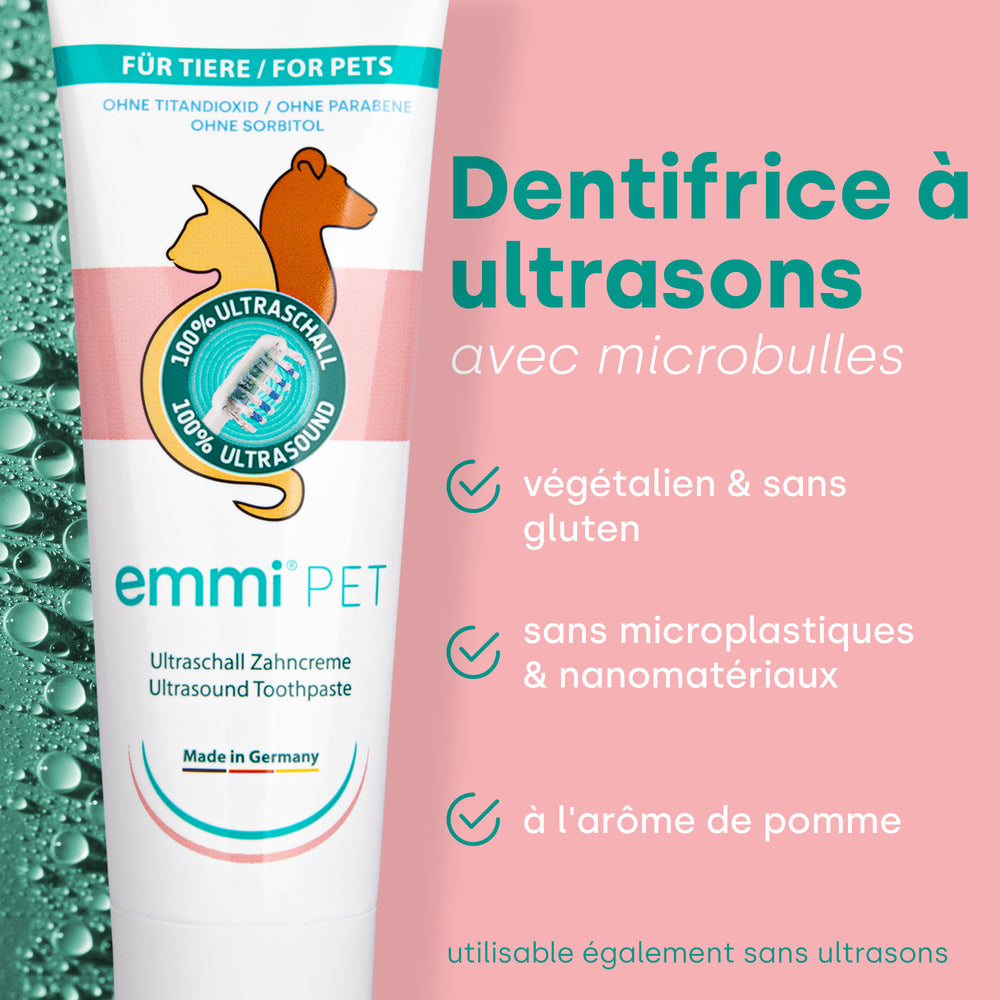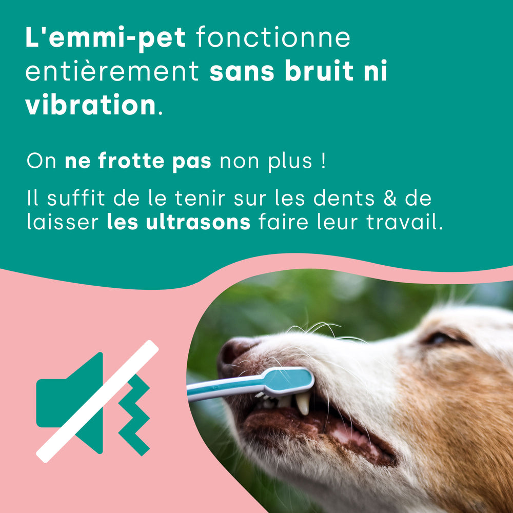 La technologie échographique unique du EMMI PET 2.0, avec jusqu'à 96 millions de vibrations échographiques par minute, offre un avantage significatif sur les méthodes de nettoyage dentaires conventionnelles.Cette innovation technologique permet de réduire doucement la plaque et de prévenir le tartre et de protéger les gencives et les zones sensibles de la bouche du chien.Dans cette fréquence, les ondes échographiques ne sont pas audibles pour le chien, ce qui rend Emmi-Pet 2.0 particulièrement adapté aux animaux.