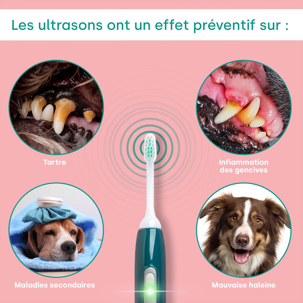Le nettoyant efficace contre la plaque et le tartre est un autre avantage important.En utilisant la technologie des ultrasons, le pinceau et le tartare du dentiste réduisent le tartare et empêche ainsi les infections des gencives.Cela contribue de manière significative à la préservation de la santé bucco-dentaire de votre chien.Une fonctionnalité supplémentaire est l'amélioration de la fréquence d'horloge qui permet un nettoyage encore plus profond.Cette technologie atteint également efficacement les zones difficiles de la bouche, ce qui est souvent difficile avec les pinceaux conventionnels.