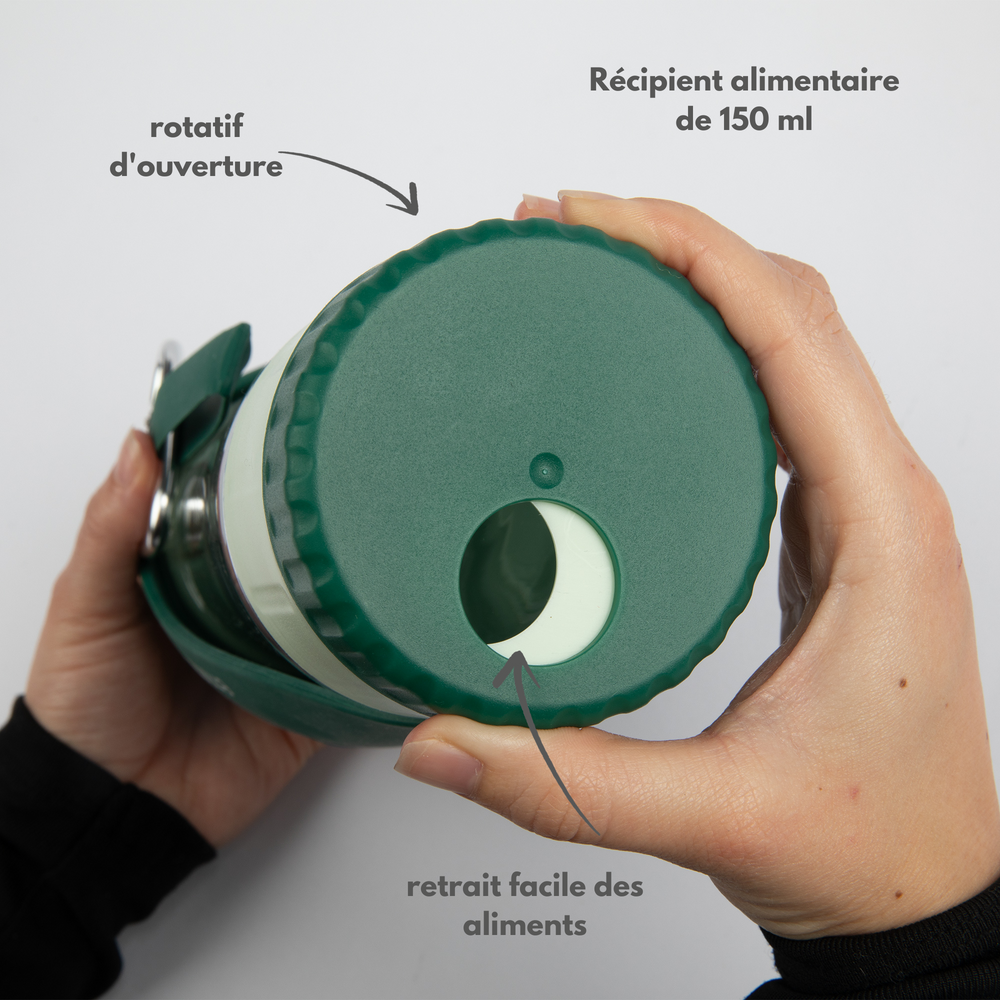 - Contenant à collation intégré : 150 ml supplémentaires pour la nourriture ou les collations-parfait pour les petites récompenses en déplacement.