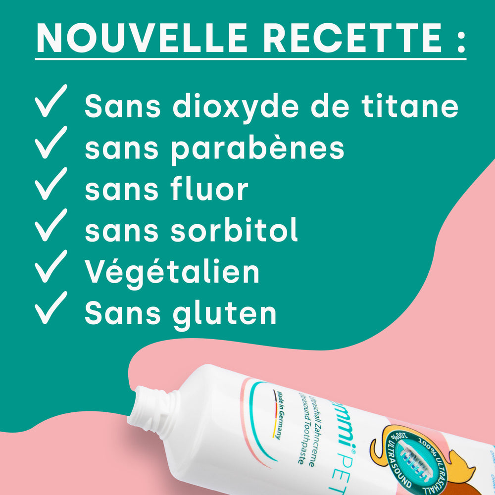 Notre dernière formule est totalement exempte de dioxyde de titane, de sorbitol, de fluorure et de parabènes. Au lieu de cela, nous nous appuyons sur des ingrédients naturels qui sont combinés dans un processus de production moderne pour maximiser la tolérance et créer un produit naturel. Ceci est particulièrement important pour les animaux sensibles à certains produits chimiques.