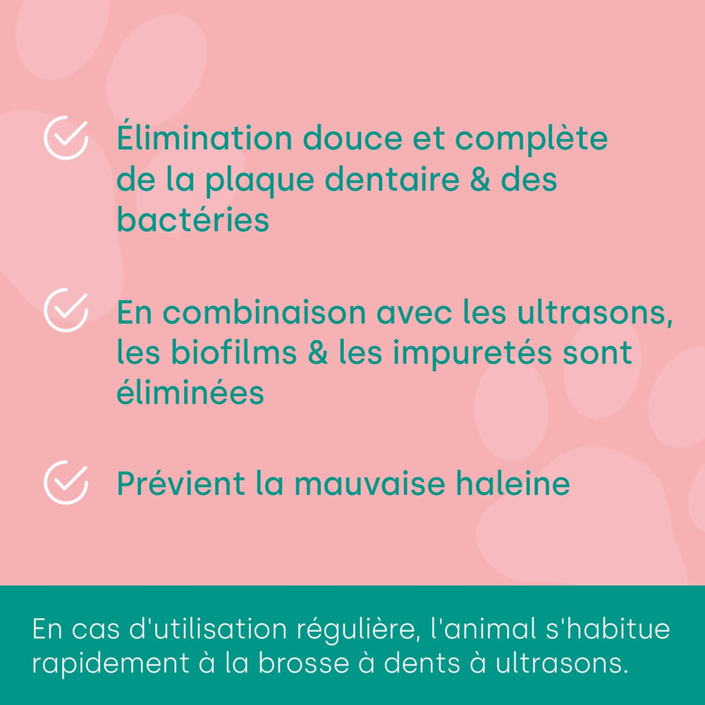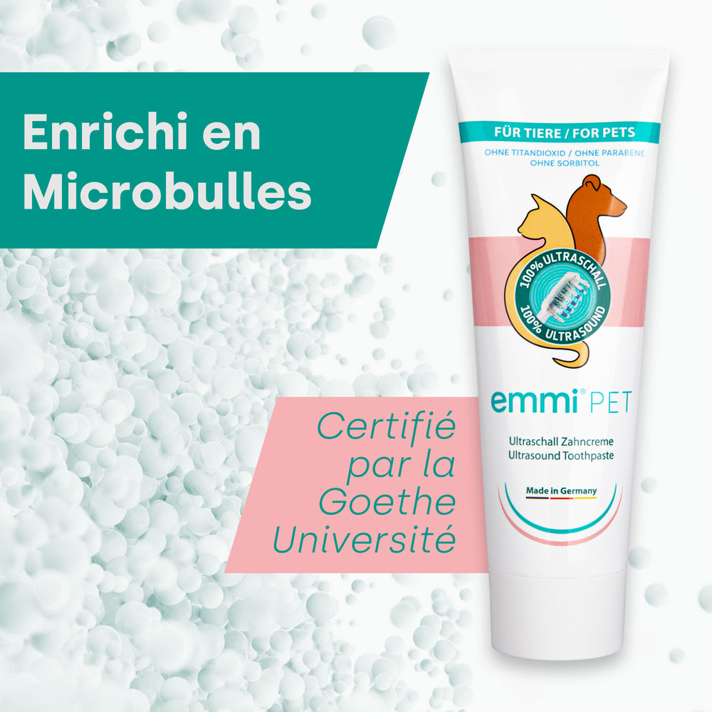 Le dentifrice à ultrasons emmi-pet pour animaux offre de nombreux avantages qui en font un excellent choix pour les soins dentaires de votre animal : Nettoyage doux sans abrasion : Grâce aux ultrasons, le brossage abrasif des dents n'est plus nécessaire. La valeur RDA (abrasion relative de la dentine) est de 0, ce qui signifie que le dentifrice est particulièrement doux pour l'émail et les gencives de votre animal. Élimination efficace des biofilms et des bactéries : la technologie des microbulles garantit que même la plaque dentaire et les bactéries tenaces sont éliminées sans exercer de contrainte mécanique sur les dents. Prévention des maladies des dents et des gencives : Un nettoyage doux mais approfondi préserve les fonctions protectrices naturelles des dents, réduisant ainsi considérablement le risque de maladies des dents et des gencives. Lutte contre la mauvaise haleine : L'utilisation régulière du dentifrice emmi-pet aide à prévenir la mauvaise haleine en réduisant le nombre de bactéries responsables des odeurs.