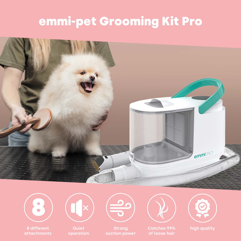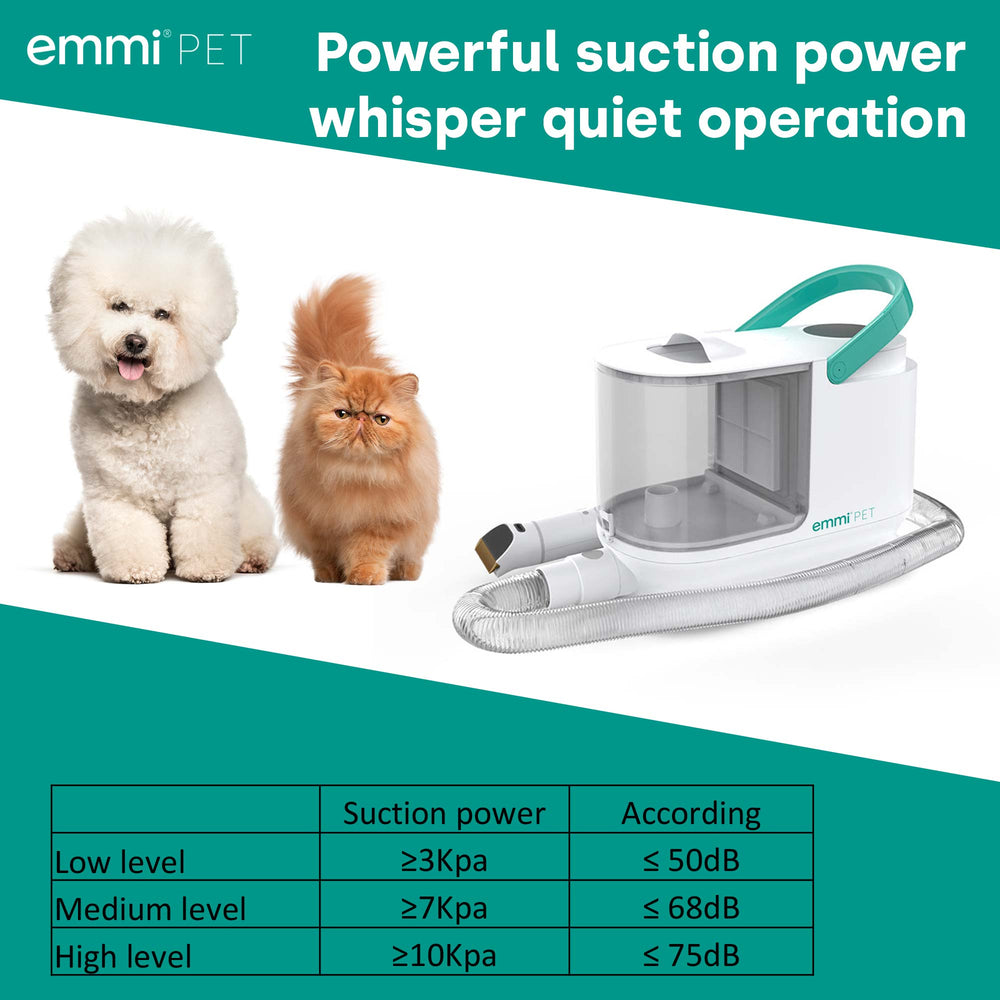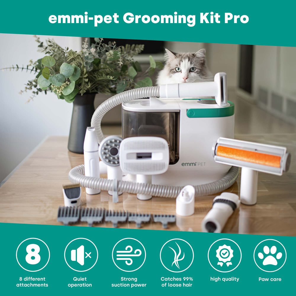 Le kit de toilettage comprend non seulement un aspirateur, mais également une tondeuse pour toiletter efficacement votre chien ou votre chat à la maison. Cela fait du kit de toilettage emmi-pet le meilleur aspirateur à poils d'animaux avec tondeuse par rapport aux autres modèles. Pour ceux qui ont besoin de soins encore plus complets, la version Pro propose également un coupe-ongles et une tondeuse à pattes spéciaux, idéaux pour un soin précis des pattes et des ongles.