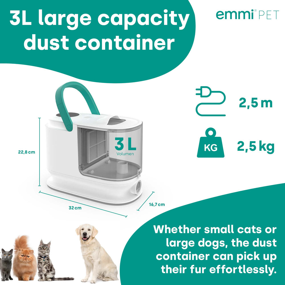 L'aspirateur pour poils d'animaux emmi-pet est non seulement puissant mais également convivial. Les 3 grandsL Le récipient pour poils d'animaux est facile à vider et à nettoyer. Outre la tondeuse, le kit de toilettage emmi-pet Grooming Kit Home est équipé de 6 types différents de brosses professionnelles, dont 1 tondeuse, 1 peigne de toilettage, 1 peigne de lissage, 1 brosse plate 2 en 1, 1 brosse avec rouleau pour poils d'animaux et 1 brosse de massage. Le kit de toilettage Pro emmi-pet contient également la tondeuse à pattes et le coupe-ongles, l'équipement parfait pour le soin des pattes. Les accessoires sont spécialement conçus pour les animaux de compagnie et conviennent donc à différents types et longueurs de pelage chez les chiens et les chats.
