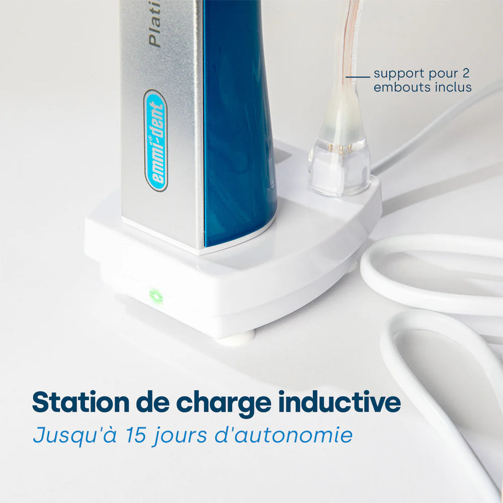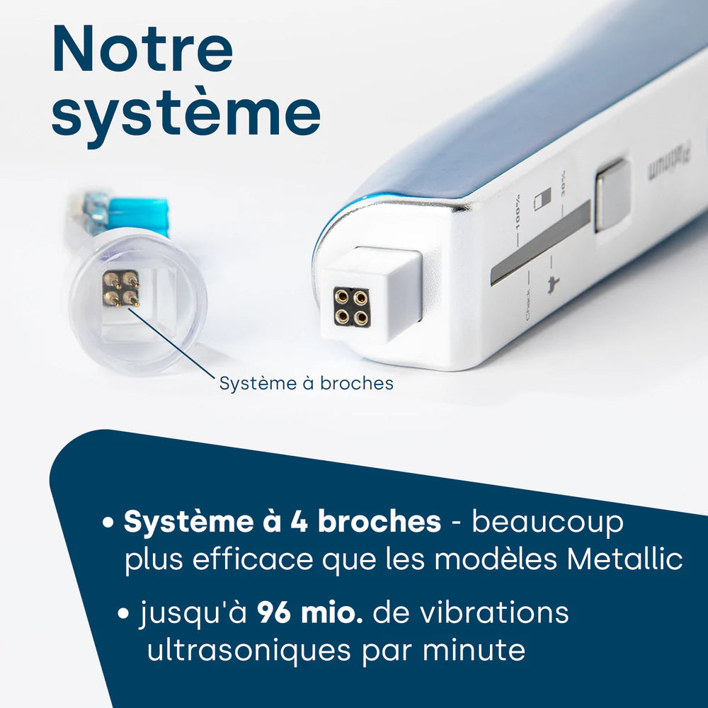 En optimisant le timing de l'échographie, la emmi-dent Modèles Platinum jusqu'à quatre fois plus efficaces que les emmi-dent modèles métalliques. Une durée de vie de la batterie plus longue et un indicateur de niveau de batterie à LED ainsi qu'un système à 4 broches (horloge à ultrasons optimisée) complètent le développement ultérieur.