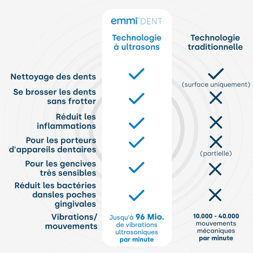 Pour la première fois dans l'histoire de l'humanité, emmi-dent, Se brosser les dents sans mouvements mécaniques possible ! Au lieu de frotter l'émail précieux de vos dents, maintenez simplement la tête de brosse sur vos dents et les ultrasons feront le reste pour vous. Des dents blanches, saines et étincelantes sont le résultat de notre technologie brevetée mondialement. L'application sans abrasion élimine tout dommage aux dents, à l'émail des dents et aux gencives.
