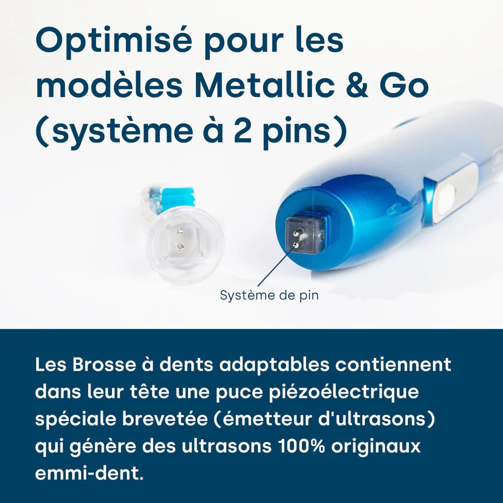 Veuillez noter que la tête de brosse à ultrasons du emmi-dent Metallic and Go exclusivement pour le nettoyage des dents et l'hygiène bucco-dentaire avec le modèle emmi-dent Métallique & Aller peut être utilisé.