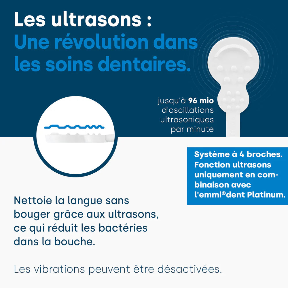Avec l'aide de la emmi-dent Les gratte-langues peuvent réduire les bactéries grâce aux ultrasons. Pour l'utiliser, placez le gratte-langue sur le emmi-dent Brosse à dents attachée.