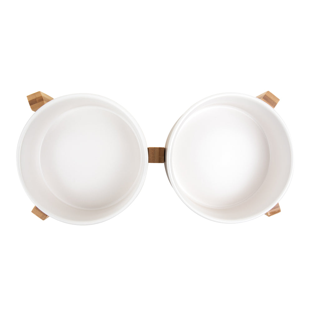 Le emmi-animal de compagnie Le bol d'eau et de nourriture en un est fabriqué en céramique de haute qualité et offre une solution pratique et peu encombrante pour nourrir votre chien. Pour résister à une utilisation quotidienne, il est très robuste et assure une longue durée de vie. Le poids agréable des deux bols et le cadre en bois assorti assurent la stabilité et garantissent le plaisir de la ration alimentaire quotidienne. Le lisse La surface des gamelles pour chien facilite l'entretien et l'hygiène quotidiens. Ils peuvent être lavés à la main ou nettoyés au lave-vaisselle. Grâce à la base antidérapante, les bols en céramique restent stables sur le sol et évitent ainsi qu'ils ne se renversent. Cela minimise les déversements et garantit un environnement propre. Le cadre en bois est recouvert de vernis pour le protéger de l'eau. La barre d'alimentation pour petits et grands chiens est un accroche-regard pour chaque propriétaire d'animal grâce à son look moderne.